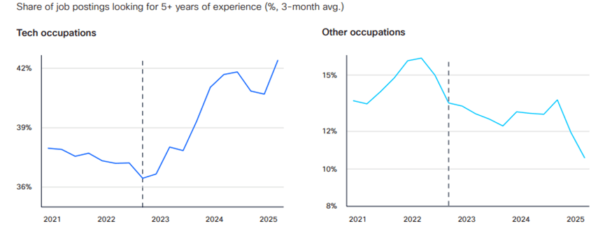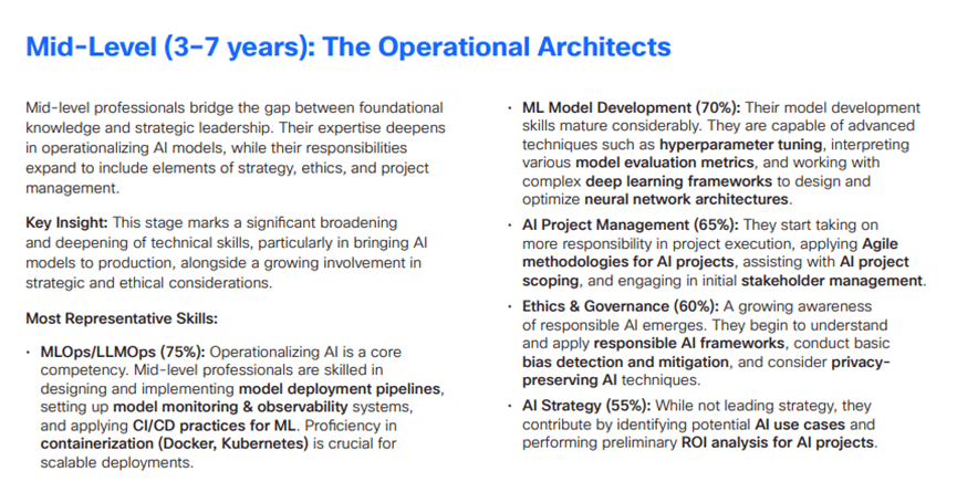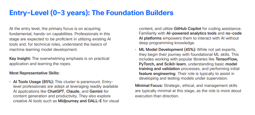 而到2025年,入门级岗亭的变化次要表现正在两个方面:一是经验要求现性提高,人文技术的缺口相对暖和,AI技术需求随职业阶段的演进呈现出清晰的梯度特征,其他如跨本能机能协做、情商等技术的供给根基可以或许婚配需求。面临AI驱动的岗亭取技术变化,即便是根本的ICT支撑岗亭。